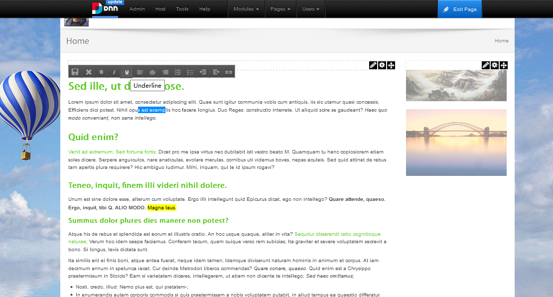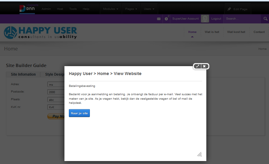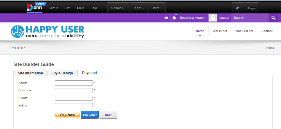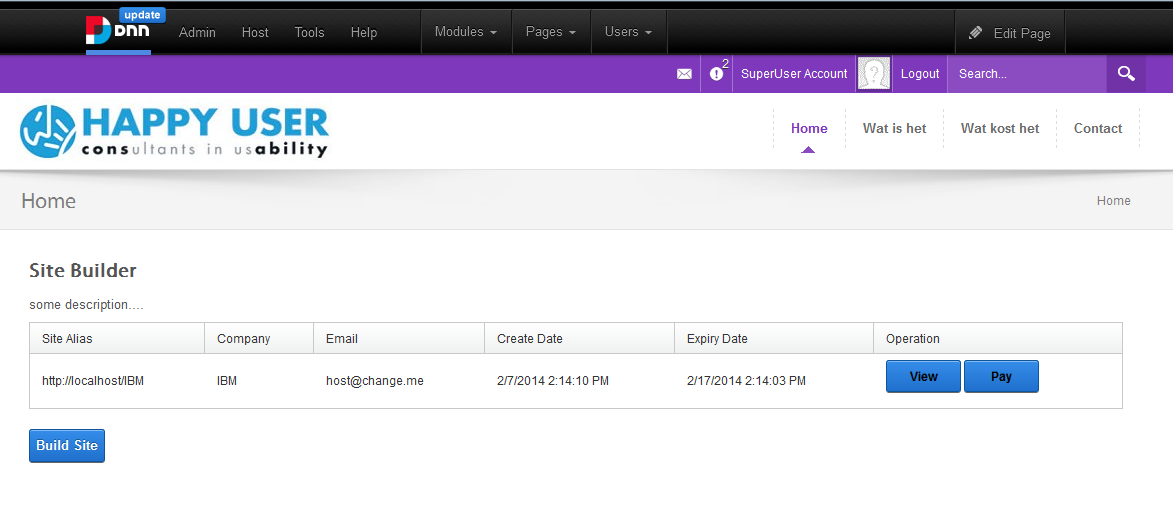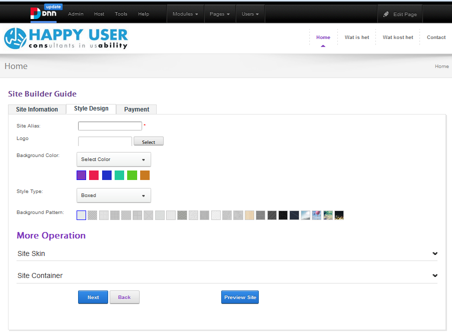 通过分析,根据我们的经验,我们推荐客户参与DotNetNuke做为CMS系统的框架,来定制这个产品,通过定制一个Site Builder module, 利用site template完成系统建站的核心功能。考虑到时间比较紧张,我们推荐客户在线购买了一套支持多种配色方案,允许定制外观支持BootStrap规范的DNN Skin。结合这套Skin的特性,我们将在Site Builder中做出一套设计器,方便用户进行定制。考虑到时间受到限制,我们推荐原型阶段只实现paypal支付实现系统收费特性。