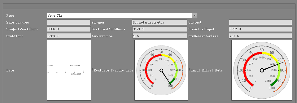 项目图表:项目图表通过仪表盘直观地显示项目的总体情况,评估准确率和投入产出比根据计划工时、报价工时、实际投入和优先产出计算得来。