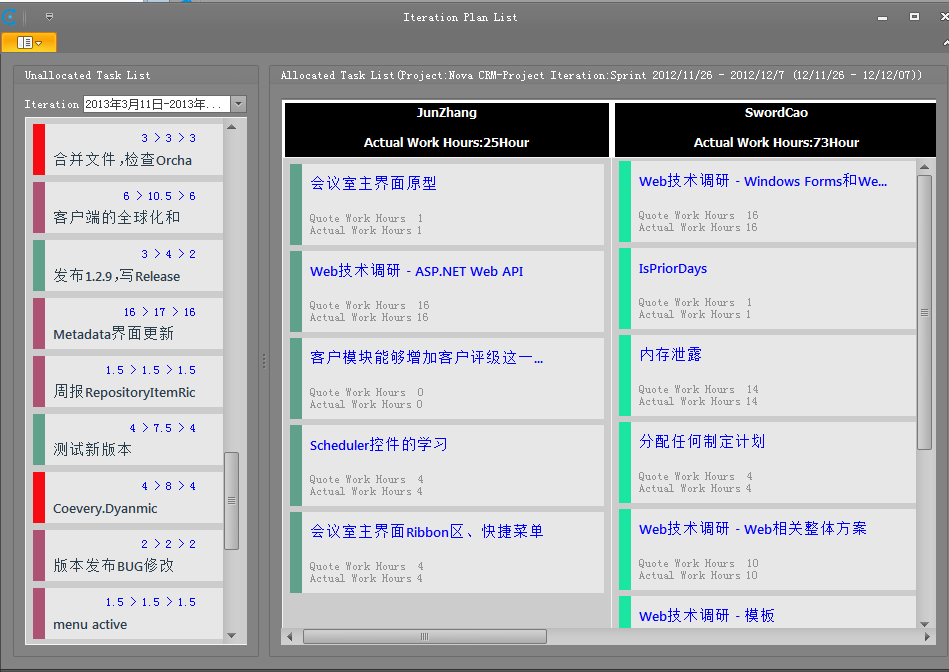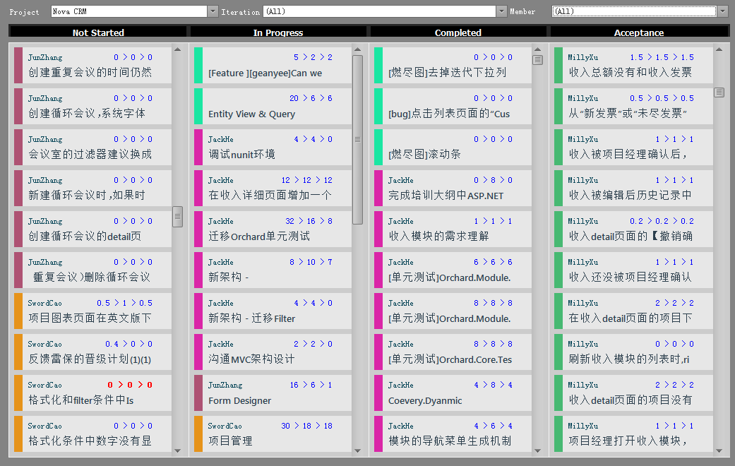 任务图表:任务图表通过看板的形式显示任务的完成状态,这里可以查看不同成员每个任务的计划工时、实际投入和有效产出。当实际投入和计划工时相差太大时系统会将数据高亮显示。